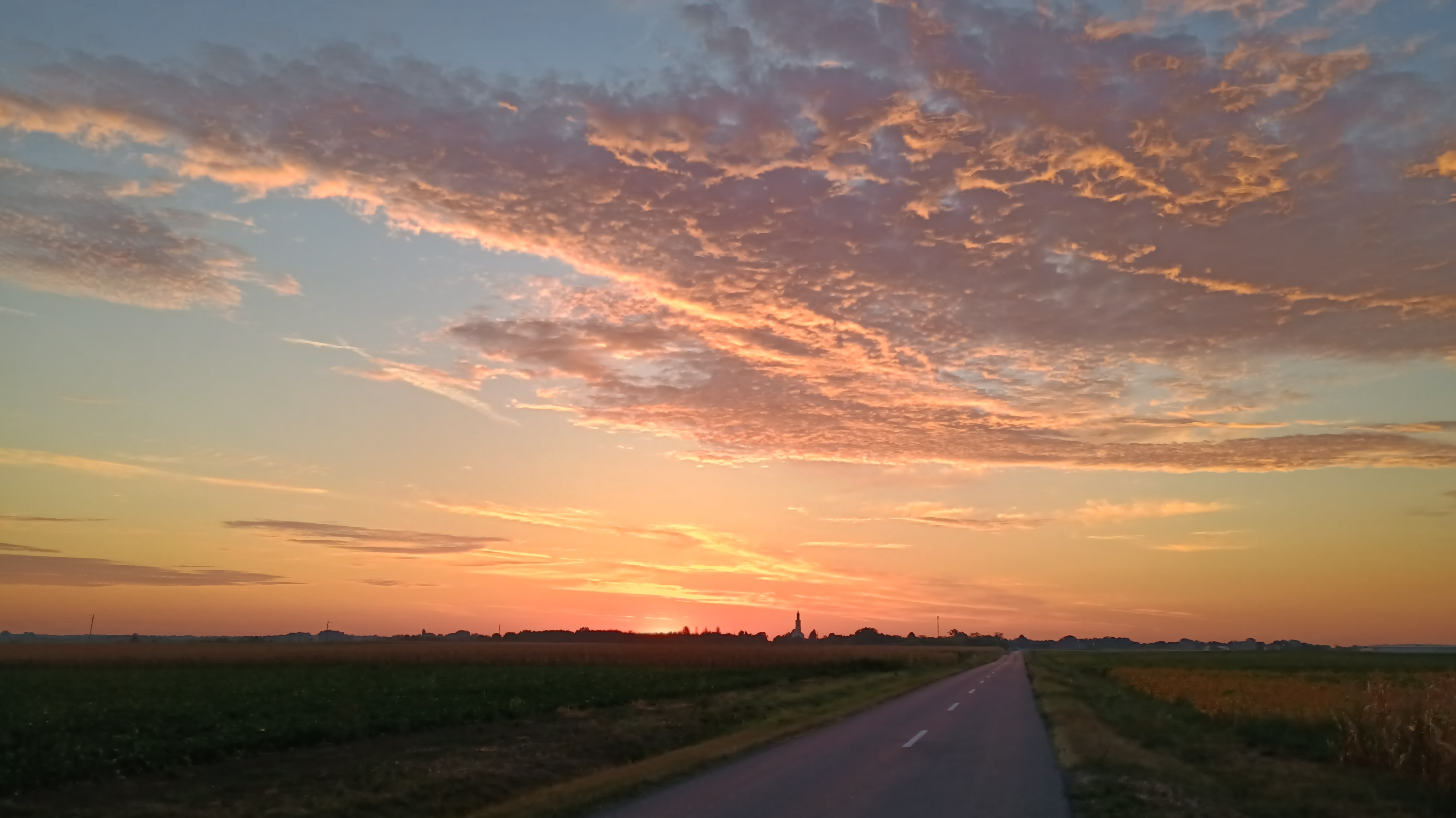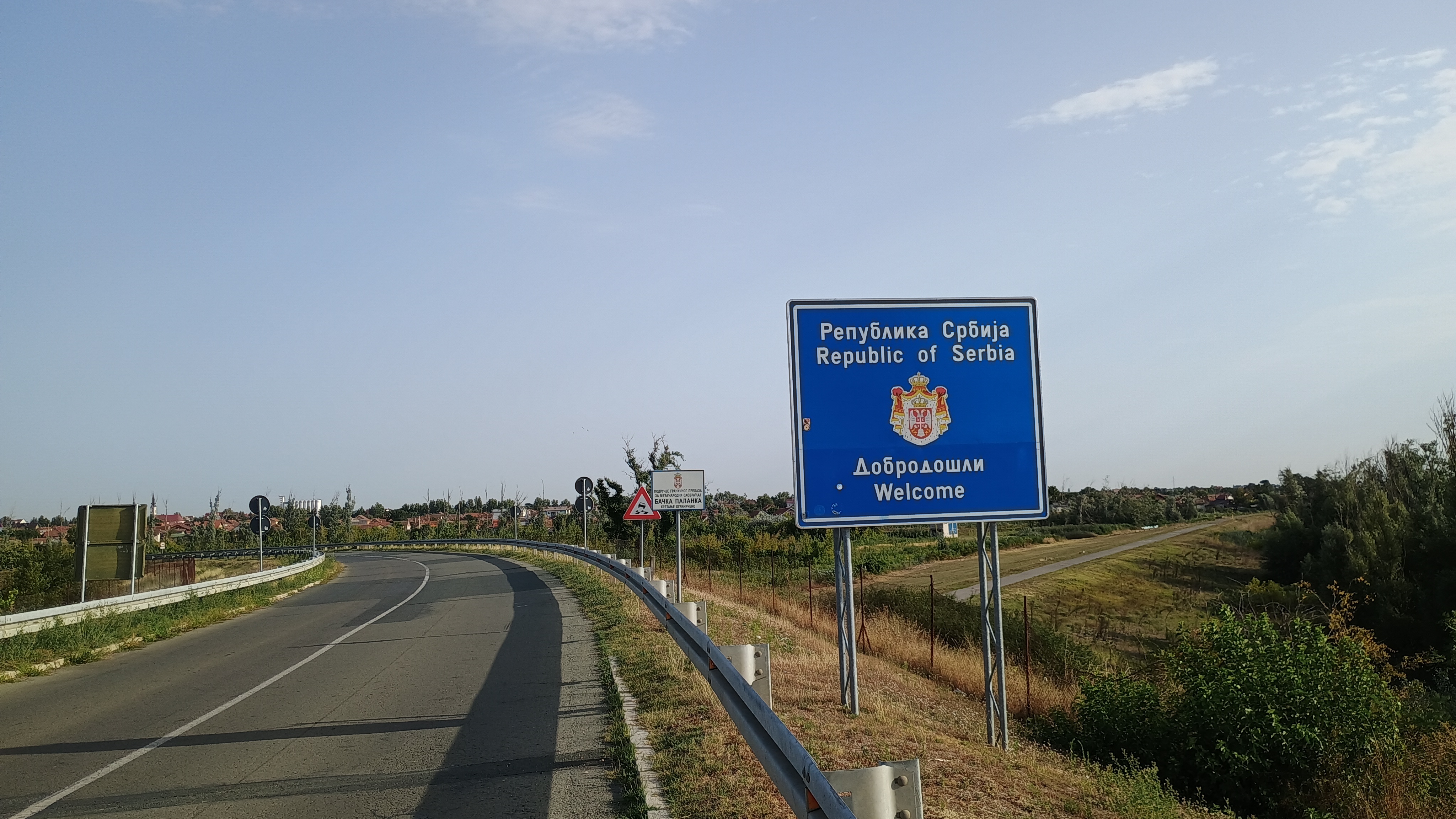 Well, the day had everything a touring cyclist could expect or want: Getting up at 4 am and leaving at 5.  Cycling in the dark for the first hour.  Watching the sun rise. Cycling on quiet country roads and then on a busy main road with no hard shoulder and lots of lorries. Four short climb at no more than 8%, just within my gear range. Strong headwind on the plateaus which meant I had to drop a gear or two. Crossing the boarder from Croatia to Serbia and getting my brand new Swiss passport stamped. Keep an eye on the time because the temperature was to rise to 40° by 2 pm. Hoping that I didn't have to stop and cook at traffic lights and finally, I met a young Italian and two Germans who were heading in the same direction.